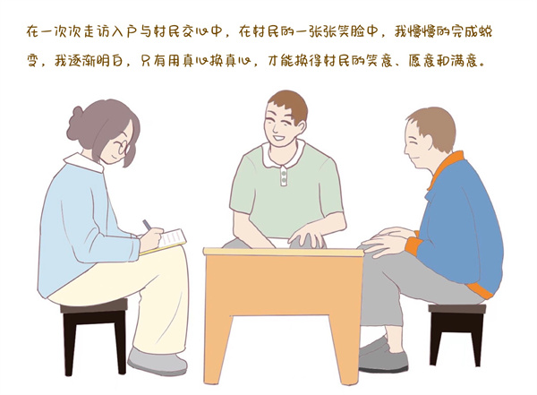 從疏到親,在交流中拉近距離,爭做群眾“知心人”。初到麻樣村時,如何快速熟悉村里的情況是我面臨的第一個難題。為了使我能夠順利上手工作,書記和小組長帶領(lǐng)我開展上門慰問、入戶走訪。每入一戶,我便在筆記本上標(biāo)注好這一戶村民家的位置、人口、耕地、收入等詳細(xì)情況,慢慢勾勒出自己的“村民地圖”,盡可能做到對每一戶的基本情況都了然于心。通過一次次的走訪入戶,不僅使我對麻洋村的基本情況有了更加準(zhǔn)確的把握,也消除了我和村民之間的距離感,從“那個駐村的小姑娘”到一聲聲親切的“小李妹”,變化的不僅僅是一個稱呼,更是村民們發(fā)自內(nèi)心的理解和信任。身處基層治理第一線,我們是直接和群眾打交道的,只有離老百姓的房門更“近”,離百姓的日?,嵤赂?ldquo;近”,才能真正讓群眾認(rèn)識、知曉,融入群眾生活、與群眾打成一片,成為廣大群眾需要的人。