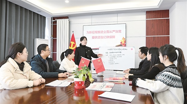 河南省洛陽市偃師區(qū)紀(jì)委監(jiān)委將學(xué)習(xí)新修訂的紀(jì)律處分條例作為今年紀(jì)律教育的“第一課”,推動紀(jì)檢監(jiān)察干部深刻認(rèn)識修訂紀(jì)律處分條例的重要意義和豐富內(nèi)涵,將學(xué)習(xí)成果內(nèi)化于心、外化于行。圖為該區(qū)紀(jì)委監(jiān)委機關(guān)第五黨支部組織學(xué)習(xí)新修訂的紀(jì)律處分條例。 牛光衛(wèi) 攝