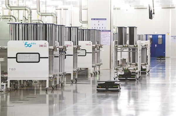 浙江省金華市不斷加快“5G+工業互聯網”融合步伐,為企業提供有效管理,助力實現智能化生產。圖為3月4日,金華市一家太陽能電池片廠內,AGV(自動導引運輸)小車承擔起物流搬運工作,在各生產單元之間穿梭。 圖片來源:視覺中國