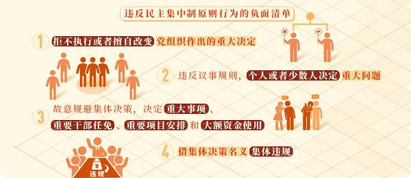 2.違反議事規(guī)則,個(gè)人或者少數(shù)人決定重大問(wèn)題。主要指違反黨章中“凡屬重大問(wèn)題都要按照集體領(lǐng)導(dǎo)、民主集中、個(gè)別醞釀、會(huì)議決定的原則,由黨的委員會(huì)集體討論,作出決定”的規(guī)定,以及各級(jí)黨組織制定的具體議事規(guī)則和決策程序。