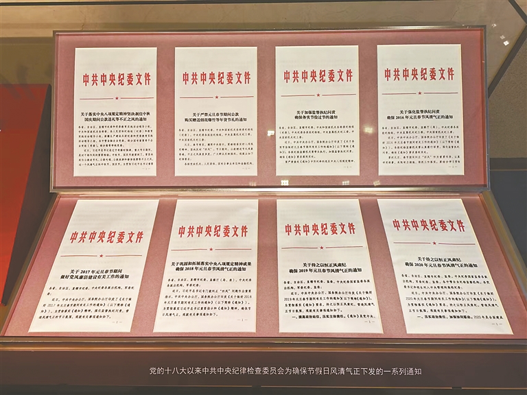 在主題展覽第四部分——“推進中國特色社會主義進入新時代,全面建成小康社會,開啟全面建設社會主義現代化國家新征程”的展品中,不僅有習近平總書記在地方考察繳納伙食費的票據和在招待所用餐時的點菜單,還有中央八項規定、黨的十八大以來制定或修訂的黨內法規等展板,還可以看到黨的十八大以來中共中央紀律檢查委員會為確保節假日風清氣正下發的一系列通知。