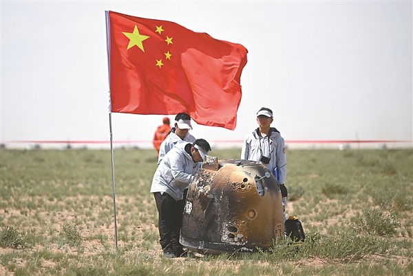 再入大氣層后,嫦娥六號如何逐步降速、穩穩一落?在降至距地面約20公里高度時,返回器轉入開傘姿態。約10公里高度時,返回器打開降落傘,完成最后減速并保持姿態穩定,隨后準確在預定區域平穩著陸。負責搜索回收任務的發射場與回收系統技術人員,根據北京中心通報的落點位置信息,規劃行動路徑,開展返回器搜索,及時發現目標,確認返回器狀態正常,有序開展回收工作。
