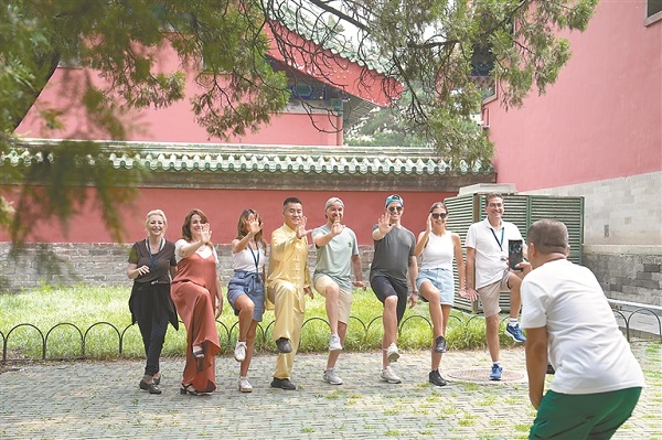 在72/144小時過境免簽等系列便利外籍人士來華的政策推動下,外籍人士中國行持續升溫。圖為7月9日,來自意大利的游客在北京天壇公園體驗太極拳后合影留念。 新華社記者 鞠煥宗 攝
