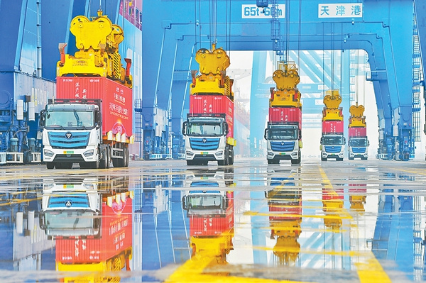 京津冀協(xié)同發(fā)展十年來,天津港集裝箱吞吐量從1300多萬標(biāo)箱增加到2218萬標(biāo)箱,航線從119條增加到145條,泊位從159個(gè)擴(kuò)充到213個(gè),躋身世界十大港口之列。三大指標(biāo)躍升背后,是生動(dòng)的港區(qū)之變、協(xié)同之變。圖為近日,在天津港集裝箱碼頭,吊車將京津冀等地區(qū)的貨物吊裝至“中遠(yuǎn)海運(yùn)阿根廷”輪。