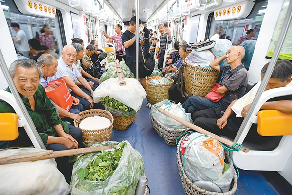 推進(jìn)社會(huì)體制改革意味著要聚焦民生關(guān)切,兜住兜牢民生底線。在重慶,有一條“背簍專線”。連接渝北區(qū)石船鎮(zhèn)和市區(qū)的軌道交通4號(hào)線開通后,不少老鄉(xiāng)背著背簍、搭地鐵去城里賣菜。圖為近日,菜農(nóng)乘坐重慶軌道交通4號(hào)線前往市區(qū)賣菜。 圖片來源:視覺中國(guó)