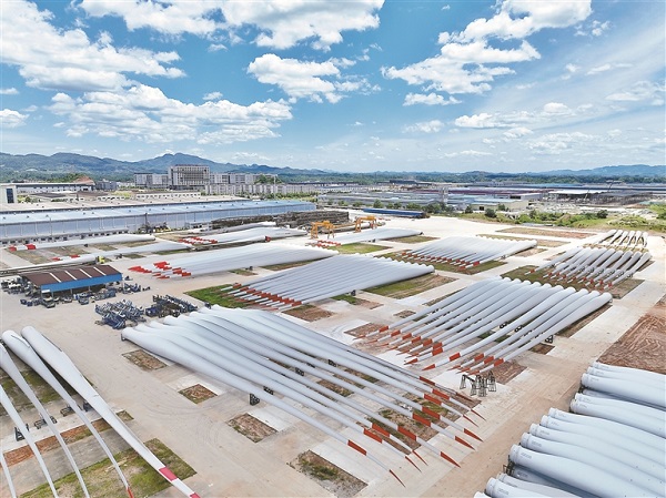 7月17日,在江西省萍鄉(xiāng)市蘆溪縣工業(yè)園內(nèi),中材科技(萍鄉(xiāng))風(fēng)電葉片有限公司生產(chǎn)制造的風(fēng)電葉片正準(zhǔn)備裝車外運(yùn)。
