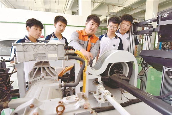 近年來(lái),河北省威縣加大職業(yè)技術(shù)人才培養(yǎng)力度,以就業(yè)市場(chǎng)需求為導(dǎo)向,積極優(yōu)化職業(yè)教育結(jié)構(gòu),通過(guò)與企業(yè)聯(lián)合辦學(xué),創(chuàng)新校企合作、定向培養(yǎng)、工學(xué)結(jié)合等辦學(xué)模式,拓寬職業(yè)教育畢業(yè)生就業(yè)渠道。圖為威縣職業(yè)技術(shù)教育中心教師為學(xué)生講解電動(dòng)汽車電機(jī)結(jié)構(gòu)。新華社記者 王曉 攝