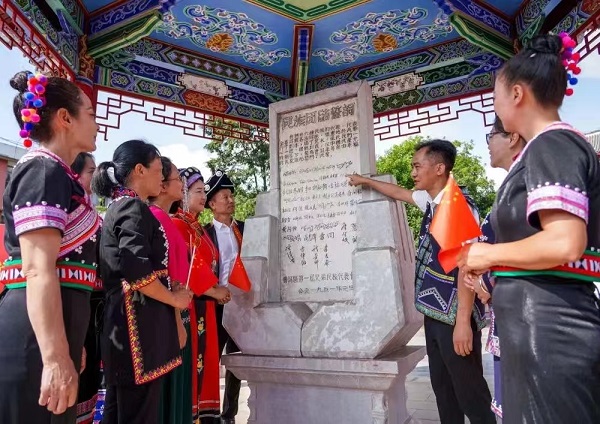 2024年9月25日,在位于云南省普洱市寧洱哈尼族彝族自治縣的民族團結園里,當地群眾參觀民族團結誓詞碑。新華社記者 王靜頤/攝
