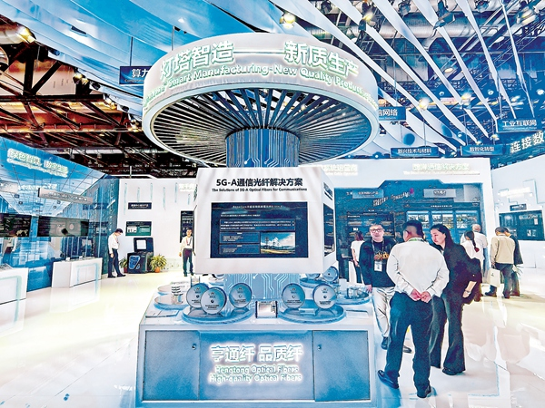 近日,中國(guó)國(guó)際信息通信展覽會(huì)上,觀眾正在參觀亨通光電“全球燈塔工廠”展臺(tái)。 圖片來(lái)源:視覺(jué)中國(guó)
