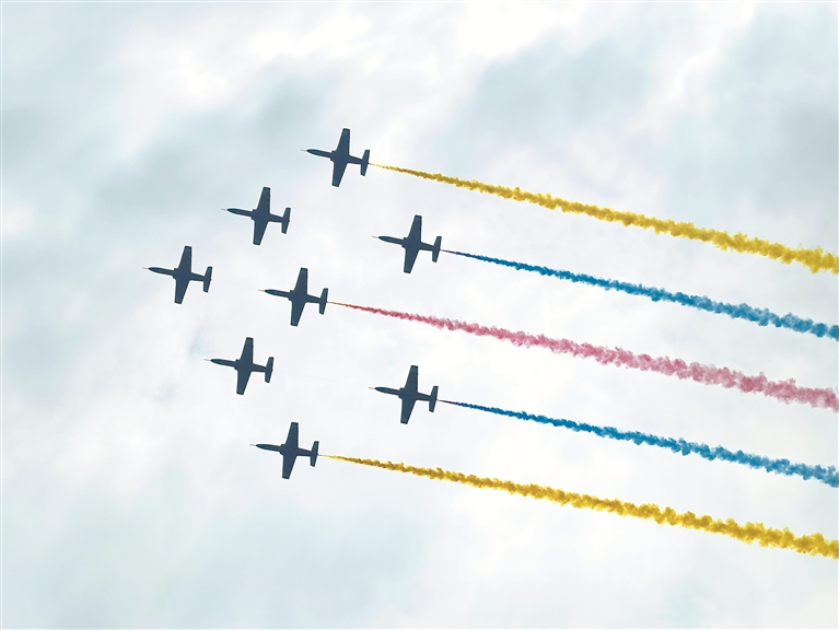 11月11日是中國人民解放軍空軍成立75周年紀念日。當天上午,在航展會場上空,空軍八一飛行表演隊和空軍航空大學“紅鷹”飛行表演隊相繼升空表演,飛行員以戰機為筆,用彩色煙帶繪就壯麗畫卷,為人民空軍“慶生”。