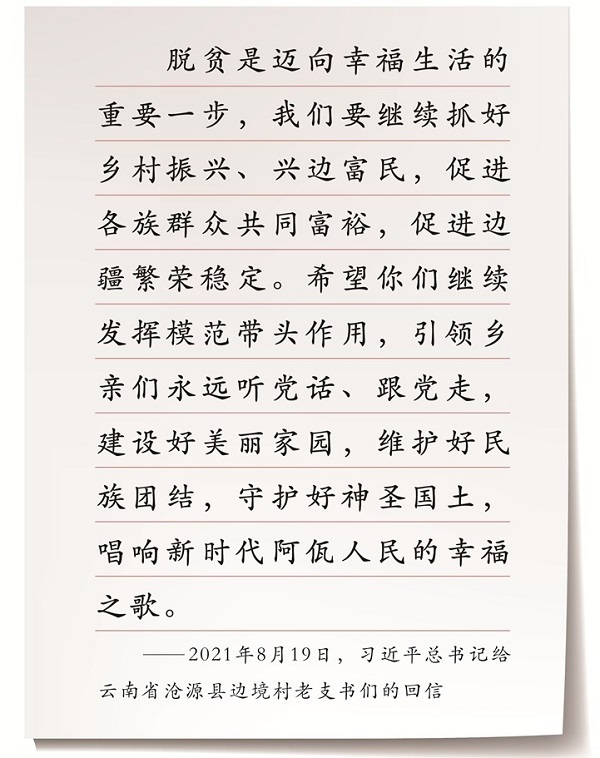 “讀了來(lái)信,了解到脫貧攻堅(jiān)給阿佤山帶來(lái)的深刻變化,感受到了阿佤人民心向黨、心向國(guó)家的真摯感情,我很欣慰。”2021年8月19日,習(xí)近平總書記回信勉勵(lì)云南省滄源縣邊境村的老支書們,并提出殷切期望。