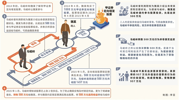 其中,2014年初,馬峻嶺和商人魏某等人了解到甲證券定向增發股票,馬峻嶺讓魏某參與。馬峻嶺曾利用職權為魏某介紹業務使其獲取巨額好處,魏某為表示感謝,允諾出資500萬元參與甲證券定向增發股票投資,并表示所獲收益送給馬峻嶺,虧損由魏某承擔。2014年4月,魏某購買了1000萬元甲證券定向增發股票,股票鎖定期為2014年4月至2015年4月。2015年1月,馬峻嶺得知該股票已上漲2倍多后,為了防止魏某反悔并及時鎖定利益,更為了規避被查處,轉賬500萬元給魏某,并與魏某約定在股票鎖定期滿后出售股票,將500萬元連同對應收益轉給馬峻嶺,該500萬元被魏某用于個人花銷。2015年5月,魏某將定向增發股票在鎖定期滿后賣出,500萬元對應獲利957萬元,馬峻嶺連同前述500萬元轉賬共收回1457萬元。