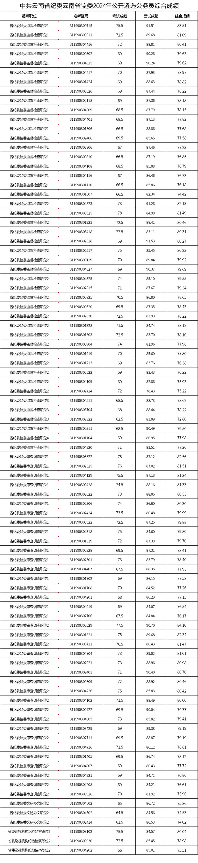 中共云南省紀委云南省監委2024年公開遴選公務員綜合成績