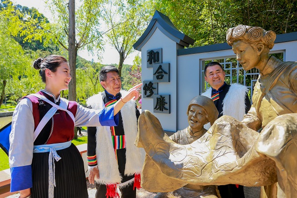 麗江市古城區挖掘本土優秀傳統文化資源,開展新時代廉潔文化建設。圖為市民群眾在黑龍潭政德教育基地“和合修廉”雕塑前感受廉潔文化。(王元春 攝)