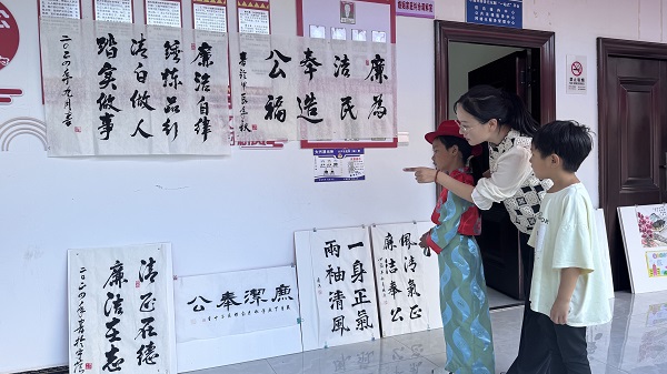 麗江市寧蒗縣大興街道開展“翰墨飄香·廉潤大興”廉潔文化進社區活動。圖為一位母親帶著兩孩童欣賞廉潔書法作品,從小培養孩子廉潔意識。(王永勤 攝)