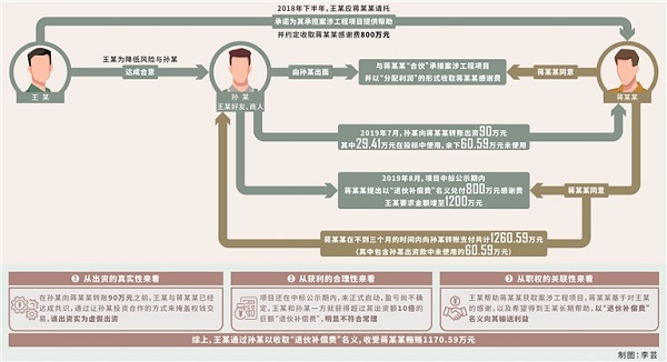 萬玉博:在案件查辦過程中,審查調查人員發現,王某為了掩蓋其與蔣某某的權錢交易,采取讓其朋友、商人孫某與蔣某某合伙承接案涉工程項目的方式,企圖將感謝費披上民事行為的合法外衣。經梳理,王某收受蔣某某感謝費主要實施了以下步驟: