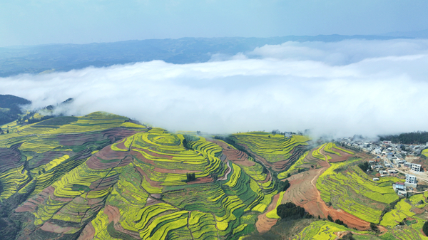 時至驚蟄,珠源大地百萬畝油菜花次第綻放,若隱若現的云霧在花海間流淌,宛若人間仙境。(方俊 攝)