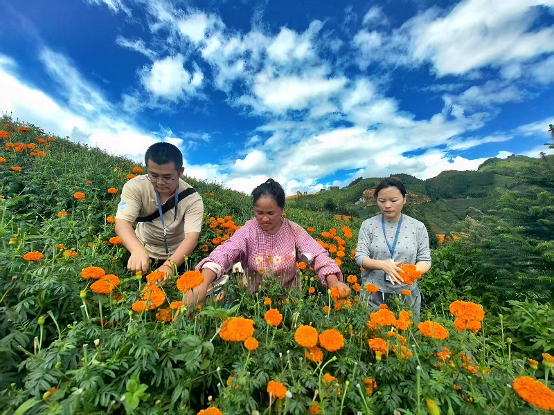 屏邊縣紀委監委聚焦花產業重點領域和關鍵環節,組織紀檢監察干部化身“民情收集員”,深入田間地頭監督,為花產業發展提供堅實紀律保障。圖為該縣紀檢監察干部向農戶了解萬壽菊種植、售賣情況(楊皓欽 攝)