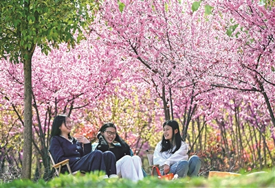 春日里,草長(zhǎng)鶯飛,人們紛紛來到戶外踏青、賞花,感受身邊的綠、眼前的美,樂享大美中國(guó)、無限春光。圖為4月6日,人們?cè)谏綎|省滕州市上善公園休閑。新華社發(fā) 李志軍 攝