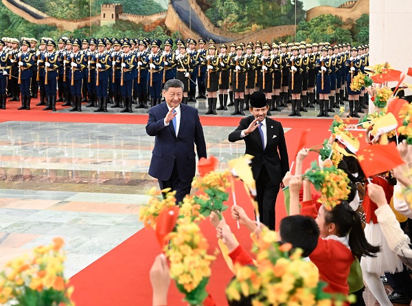 2月6日上午,國家主席習近平在北京人民大會堂同來華進行國事訪問的文萊蘇丹哈桑納爾舉行會談。這是會談前,習近平在人民大會堂北大廳為哈桑納爾舉行歡迎儀式。 新華社記者 申宏 攝