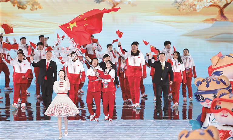 2月7日,第九屆亞洲冬季運動會開幕式在哈爾濱舉行。圖為中國體育代表團在開幕式上入場。 新華社記者 楊磊 攝