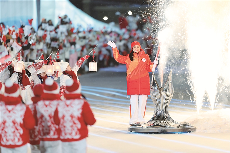 開幕式上,第四棒火炬手張虹點燃主火炬。 新華社記者 張濤 攝