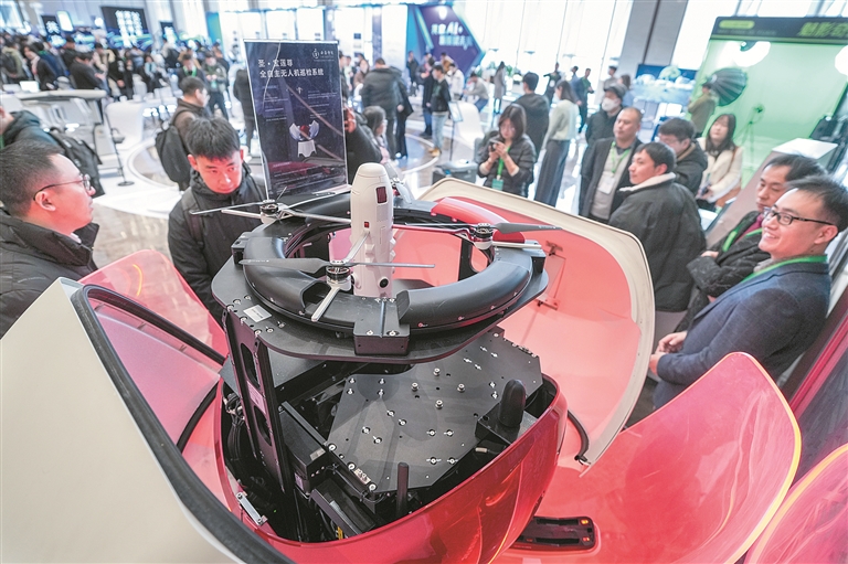 2月14日,2025年蘇州市“人工智能+”創新發展推進大會暨人工智能賦能新型工業化深度行(蘇州站)活動舉行。圖為當日,觀眾在活動現場參觀全自主無人機巡檢系統。 新華社記者 李博 攝