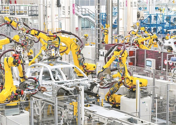 圖為位于中德(沈陽)高端裝備制造產業園的華晨寶馬里達工廠車間內一派繁忙景象,數十臺機器人正舞動手臂進行生產作業。圖片來源:視覺中國