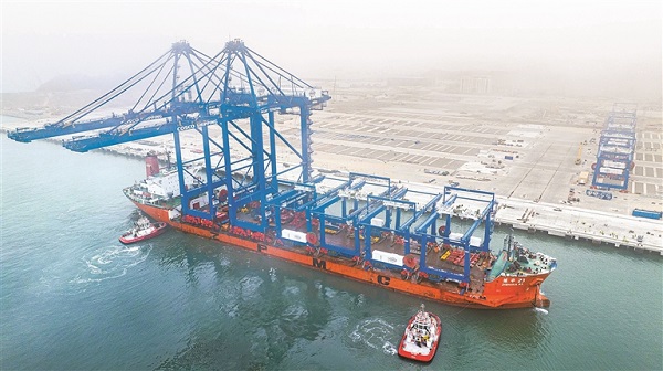 圖為岸邊集裝箱起重機和軌道吊運抵秘魯錢凱港。新華社發(上海振華重工供圖)