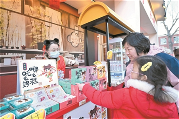 位于天津市河西區陳塘莊的哪吒小鎮舉辦哪吒小鎮文化活動周,圍繞哪吒等傳統文化主題進行劇目演藝、主題互動巡游、花燈夜游等多樣化活動,助推春日夜間文旅經濟發展。圖為游客在天津哪吒小鎮購買糕點產品。 新華社記者 孫凡越 攝