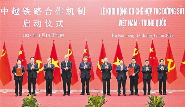 4月15日上午,中共中央總書記、國家主席習近平在河內國際會議中心同越共中央總書記蘇林、越南國家主席梁強共同會見中越人民大聯歡活動代表。這是活動后,習近平同蘇林、范明政共同見證中越鐵路合作機制啟動儀式。新華社記者 殷博古 攝