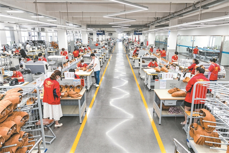 今年以來,為適應外貿市場的新變化,不少民營企業調整生產線,在開拓國際市場的同時,積極借助國內電商平臺加速“出口轉內銷”,擴展銷售渠道。圖為4月20日,在浙江省溫州市的德賽科技園車間內,工人在制鞋流水線上工作。 新華社發(劉吉利 攝)
