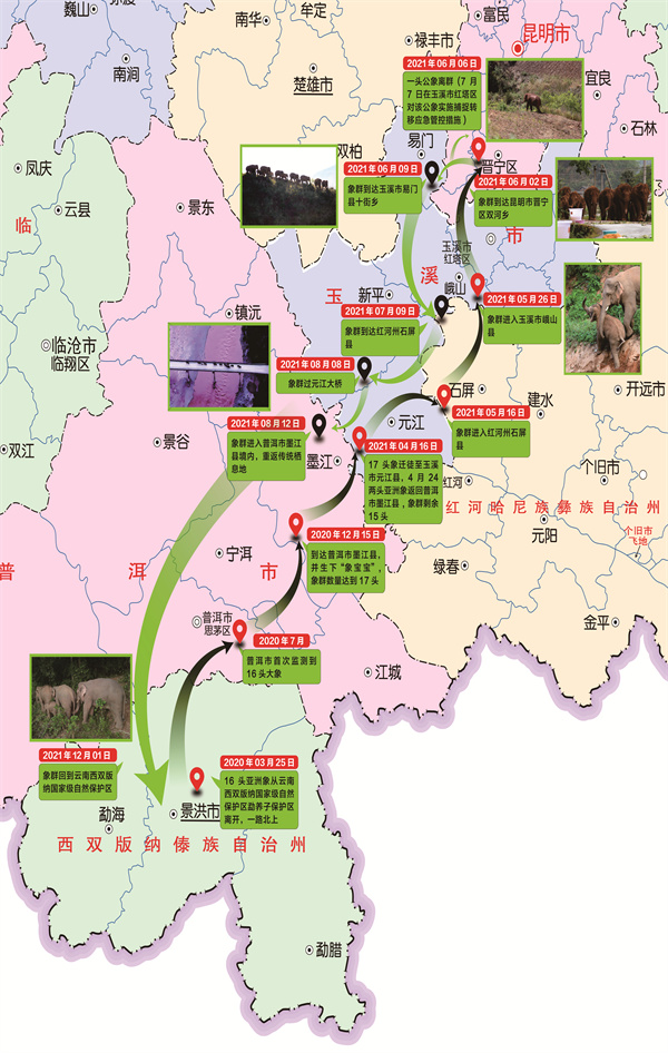 2020年,“短鼻家族”野象以一場罕見的北上南歸之旅吸引了全世界的目光。16頭亞洲象從西雙版納出發一直北上,到達昆明晉寧,歷經1300多公里的長途旅行后終歸家園。這次北上南歸之旅,引起國內外多家媒體參與報道,這也成為我們“最出色的國家宣傳片”。