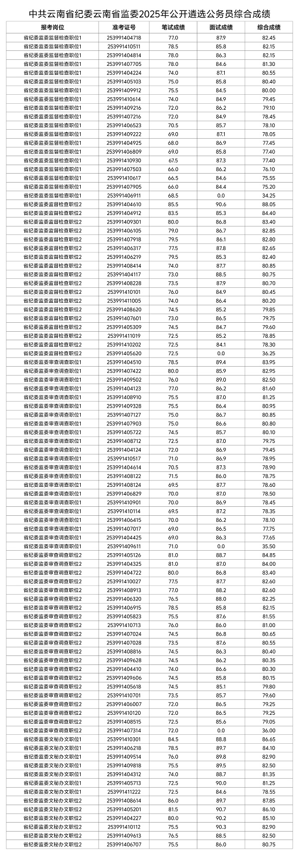 附件:中共云南省紀委云南省監委2025年公開遴選公務員綜合成績